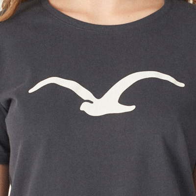 Das Möwe Girl Tee von Cleptomanicx ist ein klassisch geschnittenes T-Shirt mit Clepto's Möwen-Logo als Print auf der Front. Das Baumwollshirt kommt in gebrochenem Schwarz und mit einem extrem soften Carbon Finish.