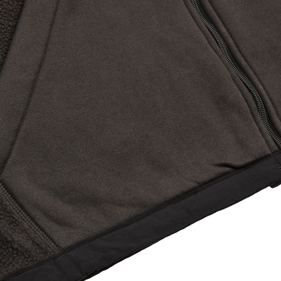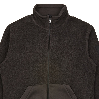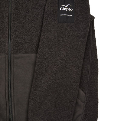 Die Samson Trainerjacke von Cleptomanicx ist eine Zipjacke aus warmem Faserpelz-Teddystoff mit grosser Kängurutasche, Nylon Taslan-Elementen und Patch auf dem Arm.