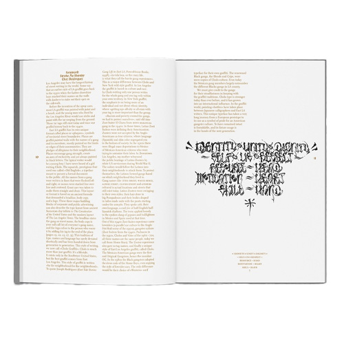 Hier wird die ästhetische Entwicklung von Cholo Writing dokumentiert und der Einfluss von Frakturschriften und kalligraphischen Vorbildern wie Old English anhand von zwei Fotosammlungen nachgezeichnet. Eine davon stammt von dem Kalifornier Howard Gribble, der Anfang der 1970er Jahre Chicano-Gang-Graffiti in einem weitläufigen geografischen Gebiet fotografierte, und eine vom französischen Grafikdesigner und Schriftsteller François Chastanet, der 2008 in dieselben Stadtteile von Los Angeles reiste, um Inschriften aus dem frühen 21. Jahrhundert zu dokumentieren.