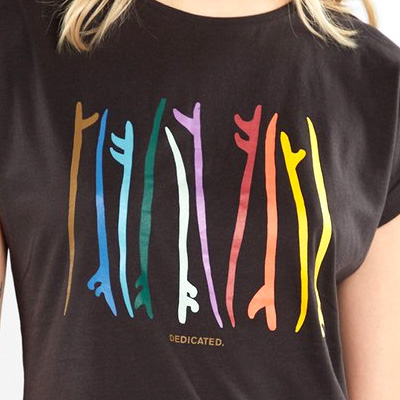 Das Vispy Color Surfboards T-Shirt von Dedicated aus Schweden ist ein Baumwoll-T-Shirt mit farbigen Surfboard Print auf der Front.