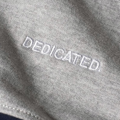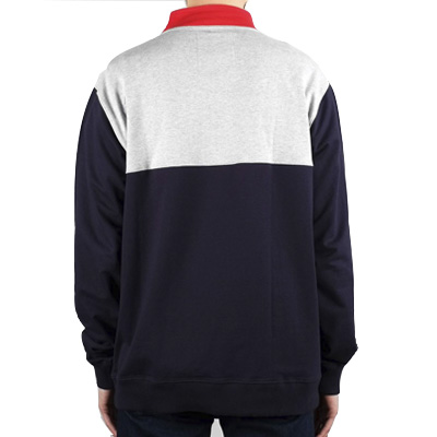 Der Duvet Dedicated Logo Zip Sweater von Dedicated aus Schweden ist ein nicer Pullover mit Color-Block Design in Dunkelblau, Grau und Rot, hohem Kragen, kurzem Reissverschluss und gesticktem Logo auf der Brust.