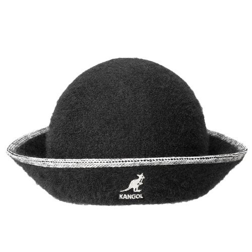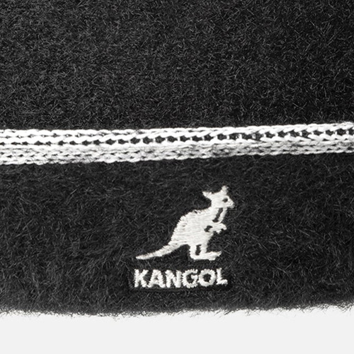 Bei heruntergeklappter Krempe ist der Kangol-Schriftzug auf der linken Kopfseite platziert. Klappt man die Krempe hoch, rückt das markante Kangol-Känguru in die Mitte.