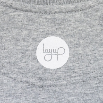Der Layup Logo Sweater, mit grossem weissem Logodruck auf der Vorderseite und kleinem Circle-Logo im Nacken. Der graumelierte Pullover ist fair produziert aus 85% Bio-Baumwolle und 15% recyceltem Polyester.