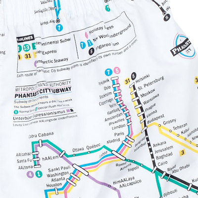 Die Phantastic City Boxershorts sind eine Co-Produktion vom Hamburger Graffitishop Under Pressure und dem Hamburger Boxershort-Label Lousy Livin. Da hast Du den besten Subway-Plan aller Zeiten direkt auf den Boxershorts dabei - hier liegt St. Pauli direkt neben Washington und von Helsinki gibts eine direkte Linie nach Quito. Hammer!