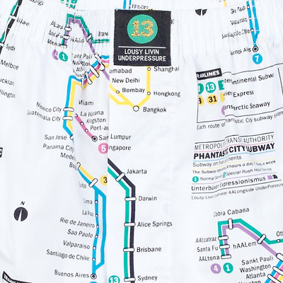 Die Phantastic City Boxershorts sind eine Co-Produktion vom Hamburger Graffitishop Under Pressure und dem Hamburger Boxershort-Label Lousy Livin. Da hast Du den besten Subway-Plan aller Zeiten direkt auf den Boxershorts dabei - hier liegt St. Pauli direkt neben Washington und von Helsinki gibts eine direkte Linie nach Quito. Hammer!