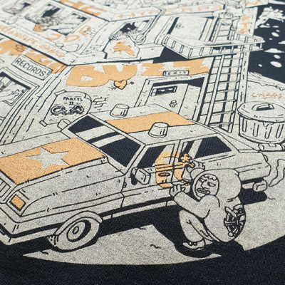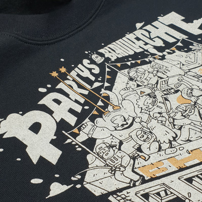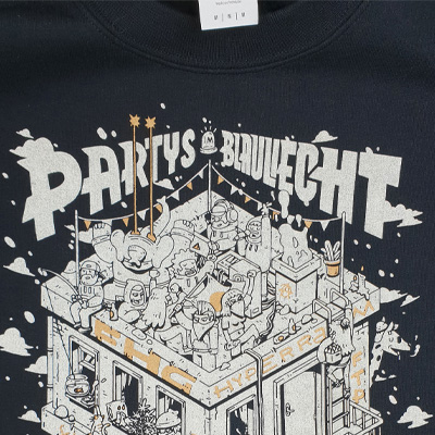 Der Partys im Blauliecht Sweater von den Berner Rappern Migo & Buzz mit einem Burner Design auf der Front und kleinem Logo-Print im Nacken.