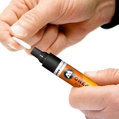 Der One4All Twin Marker von Molotow kommt mit zwei Spitzen - auf der einen Seite gibts eine 1,5mm Crossoverspitze und auf der anderen Seite einen 4mm Rundfilz.