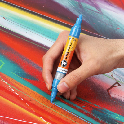 Der One4All Twin Marker von Molotow kommt mit zwei Spitzen - auf der einen Seite gibts eine 1,5mm Crossoverspitze und auf der anderen Seite einen 4mm Rundfilz, bereits ausgestattet mit den Refill Extensions für einfaches Nachfüllen und Farbmischen.