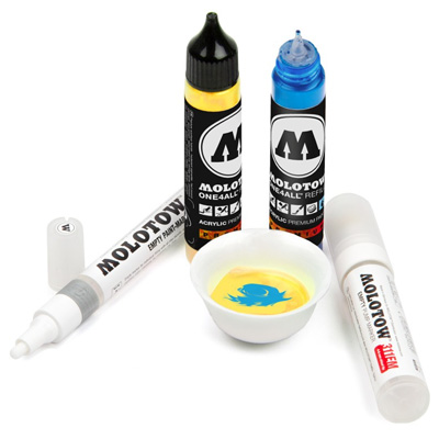 Die hochdeckende Molotow One4All Farbe auf Acrylbasis ist seidenmatt, zeichnet sich durch hohe UV-Beständigkeit aus und lässt sich mit anderen One4All Farben vermischen. Erhältlich in 74 verschiedenen Farben, geeignet zum Nachfüllen der Marker oder zur direkten Anwendung mit Pinsel oder Airbrush Pistole. Die Acrylfarbe eignet sich für drinnen wie draussen und für das Bemalen von fast allem: von Papier oder Leinwand bis zu schwierigen Oberflächen wie Holz, Stoff, Beton und selbst Leder.