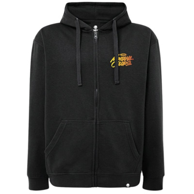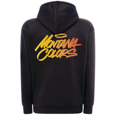 Der MTN Hooded Zipper Walking Logo von Montana Colors ist ein schwarzer Kapuzenpullover mit durchgehendem Reissverschluss und Kängurutasche. Das Hand Style Design mit dem Gelb-Orangen Farbfading gibts gleich zweimal aufgedruckt: einmal klein auf der Brust und einmal gross als Backprint.
