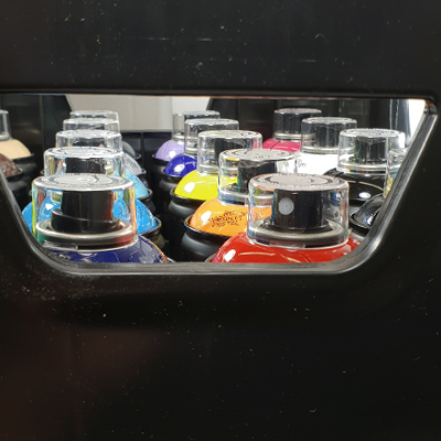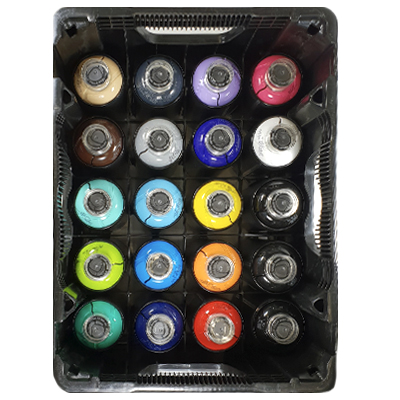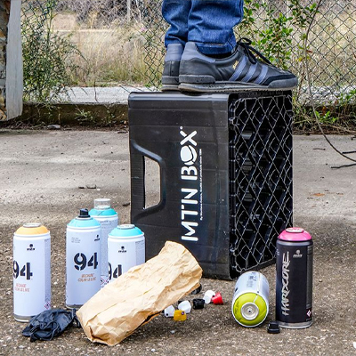 Die MTN BOX ist eine stapelbare Kunststoffbox, mit der Spraydosen praktisch transportiert und ordentlich aufbewahrt werden können, ob zu Hause, im Atelier oder im Kofferraum. Zudem kann sie beim Malen zum draufstehen benutzt werden, so kommt man gut 40cm höher rauf!