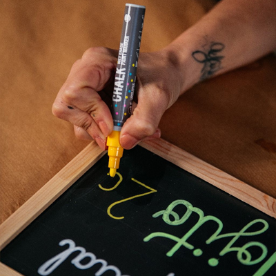 Der MTN Chalk Marker ist ein 2 mm dicker Filzstift mit hoher Deckkraft, dessen Farbe sich leicht wieder entfernen lässt. Die Farbe wurde speziell für temporäre Anwendungen wie Dekoration oder jede andere Situation entwickelt, in der eine sehr vielseitige Farbe benötigt wird, die sich später einfach entfernen lässt.