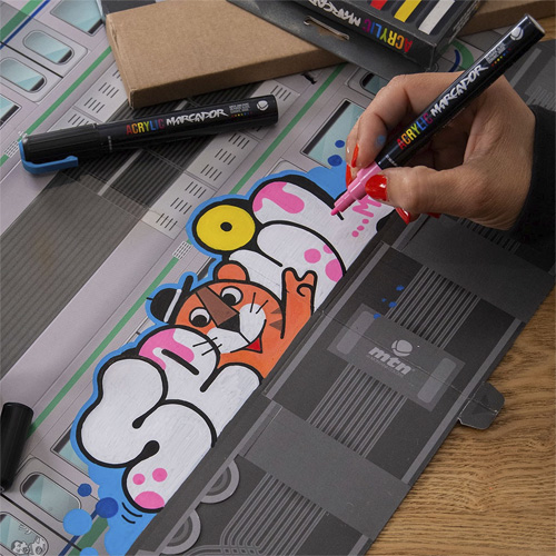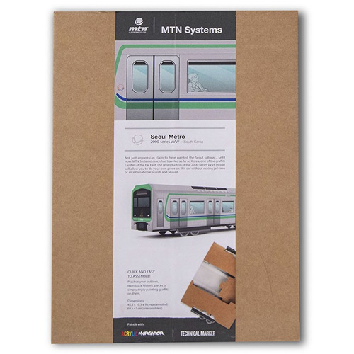 Die MTN Systems Mini-Trains zum Bemalen. Die originalgetreuen Züge sind auf Faltkarton gedruckt und lassen sich leicht zusammenbauen, mit allen Lackmarkern kannst du deinen Style drauf malen, z.B. mit den MTN Acrylic Marcador Marker. Hier gibts einen Wagen der Seoul Metro.