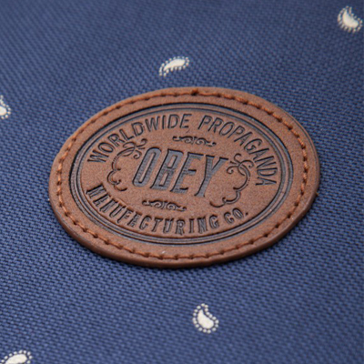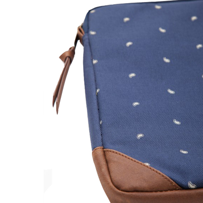Das Ballast Laptop Case von Obey Clothing ist eine stylische schaumgepolsterte Laptop-Hülle aus mit Mikro-Paisley-Muster bedrucktem dunkelblauem Stoff kombiniert mit Kunstlederversärkungen und Logobadge.