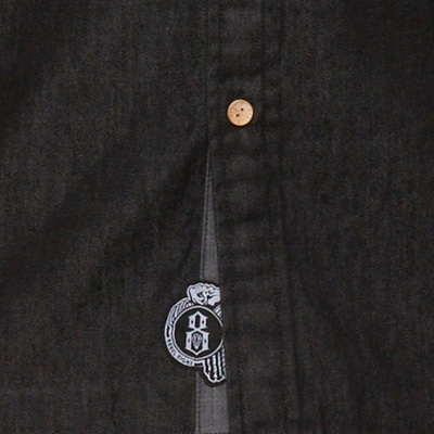Das Deinim Hemd von REBEL8 ist ein Button-Up Langarmhemd aus mittelschwerem schwarzem Jeansstoff, mit gewobenen Logolabels über dem Saum und an der Brusttasche und hellen Rebel8-geprägten Holzknöpfen.