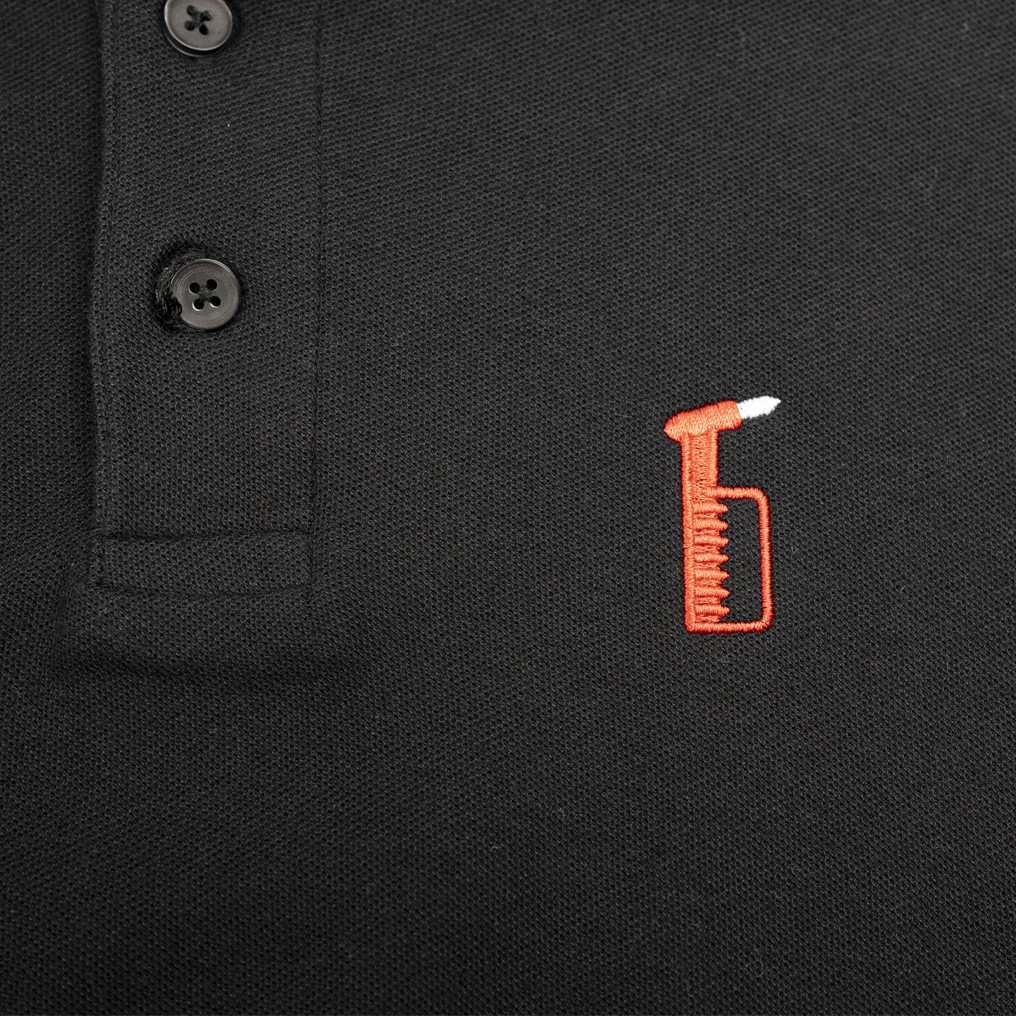 Das Nothammer Polo Shirt vom Label SixSixSeven aus dem Ruhrpott ist ein schlichtes schwarzes Polo aus Piqué-Baumwollstoff, mit kleinem schick gesticktem Nothammer-Design auf der Brust.