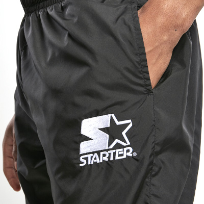 Die Starter Logo Trackpants kommen in Loose Fit Passform und aus leichtem Polyesterstoff - richtig bequem und dynamisch. Zwei diagonal eingesetzte Streifen auf der Rückseite der Waden setzen klare Akzente. Sicheren Halt bringen der elastische Bund und die ebenfalls elastischen Beinabschlüsse. Die Jogging-Hose besitzt zwei Seitentaschen und eine Gesässtasche mit Reissverschluss. Ein grosses, gesticktes Starter-Logo unterhalb der linken Seitentasche rundet das Gesamtbild gekonnt ab.