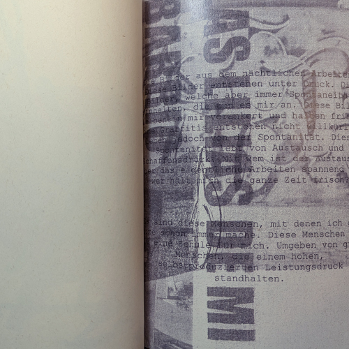Mithilfe kurzer Textabschnitte wird sein Schaffen, in drei lose gegliederten Kapiteln, durch ihn selbst beschrieben. Im Heft sind verschiedene Bilder zu sehen, die sich mit dem natürlichen Prozess des Graffitimachens beschäftigen – von der Zeichnung über das Bild an sich, bis hin zur Datei und der Erinnerung.