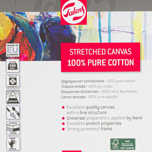 Die TALENS Leinwände haben eine universal präparierter Leinwand mit einer mittelfeinen Struktur, straff gespannt auf einem unbehandelten Fichtenholzrahmen (Dicke 21 mm), und werden komplett mit Buchenholzkeilen für das Nachspannen der Leinwand geliefert. Die Leinwand ist auf der Rückseite geheftet, so dass die Seiten auch bemalt werden können.