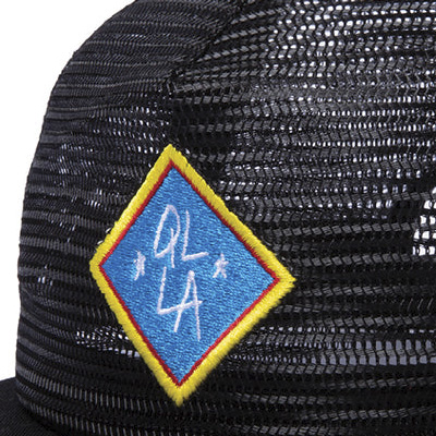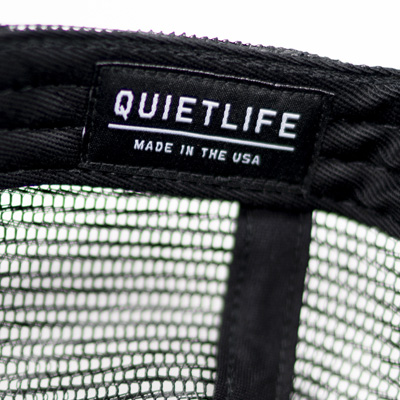 Das Trucker Cap QL LA von The Quiet Life aus Los Angeles, aus Poly-Mesh und Polycotton mit gesticktem Patch auf der Front, hinten ein kleiner Logo-Flag neben dem Snap-Back-Verschluss.
