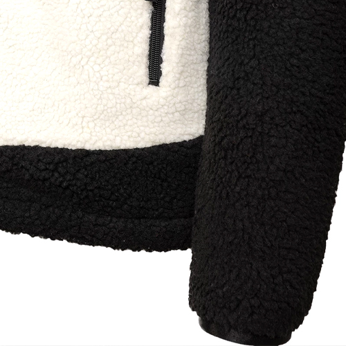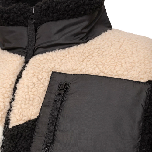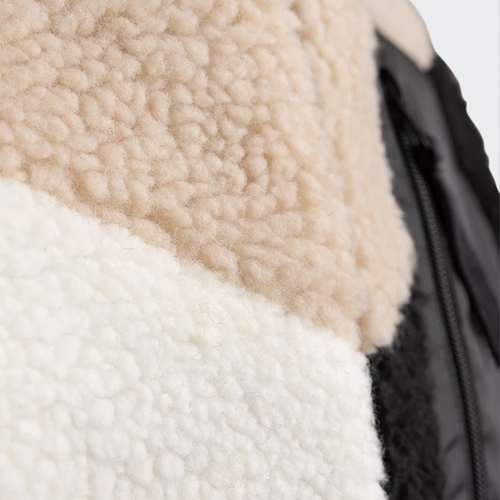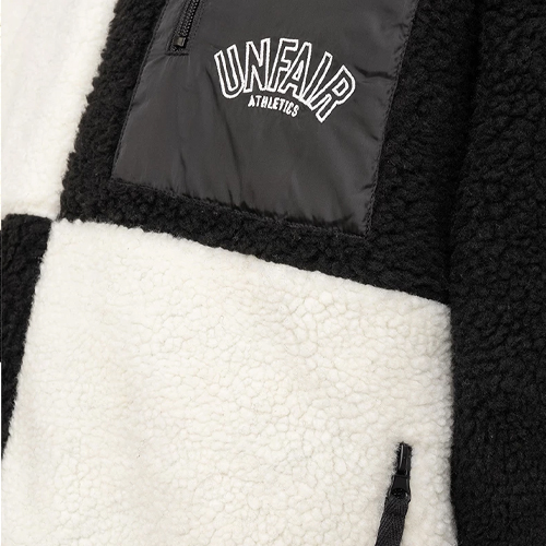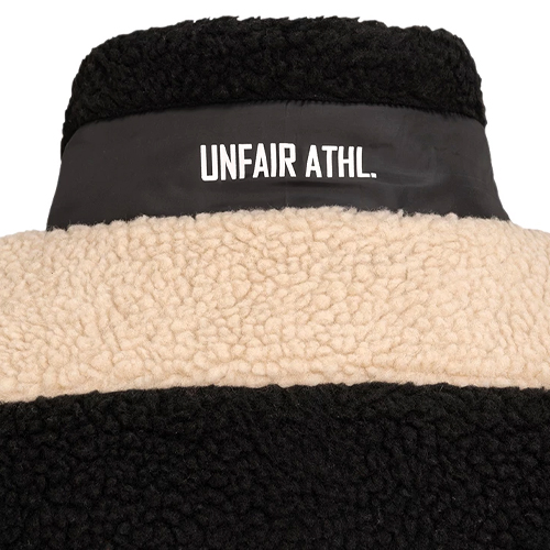 Die Unfair Athletics Polarjacket Colormix ist eine kuschlig-warme, hochwertige Faserpelzjacke in Beige und Schwarz mit Fronttasche im Materialkontrast, Logo-Stick auf Brust und im Nacken.