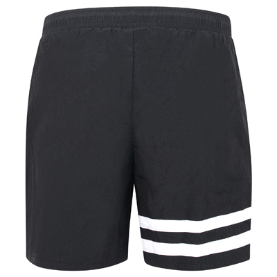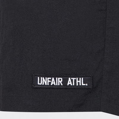 Leichte Shorts aus oldschooligem Crushed-Stoff von Unfair Athletics: die DMWU Crushed Shorts in schwarz kommen in relaxed fit, mit gesticktem "Unfr Athl."-Badge am linken Bein und eingenähten weissen Streifen am rechten Bein. Zwei Seitentaschen mit Reissverschlüssen, verstellbarem Gummibund, Mesh-Innenfutter und Flag-Label in der Seitennaht.