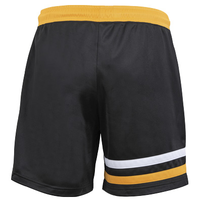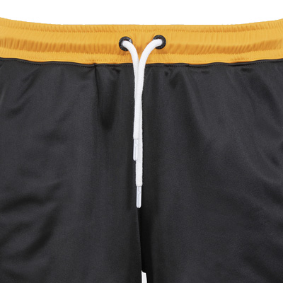 Sportliche Shorts von Unfair Athletics: die DMWU Hammers Shorts kommen in Schwarz mit eingenähten goldgelben und weissen Querstreifen und goldgelbem elastischem Saum, eingelegten Seitentaschen mit Reissverschluss und UNFAIR ATHL. Applikation am linken Bein.