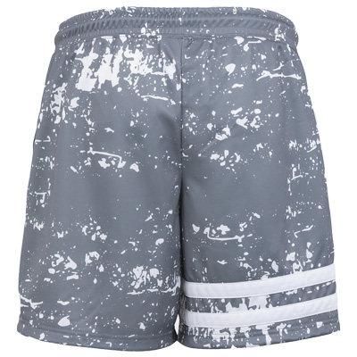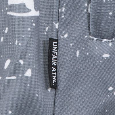Sportliche Shorts mit Farbklecks-Optik von Unfair Athletics: die Rembrand Shorts kommen in Grau, mit eingenähten Querstreifen in Weiss, gestickter UNFAIR ATHL. Applikation am linken Bein und weissem Allover-Farbflecken-Design.