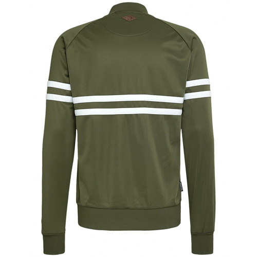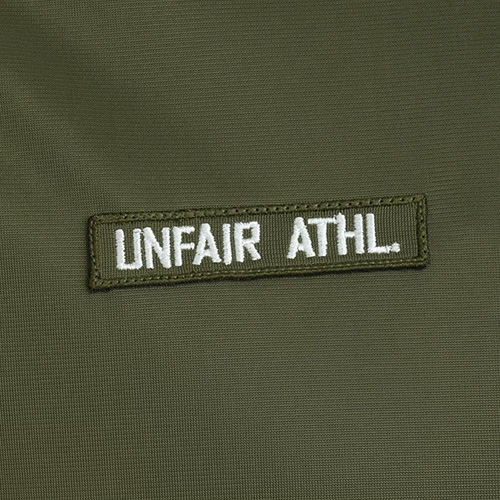 Der Klassiker! Olivfarbenes Tracktop von Unfair Athletics im klassischen DMWU Design. Horizontalen eingenähte Querstreifen und UNFAIR ATHL. & DMWU Logo Applikation. Logo-Reissverschluss, Rauten-Lederapplikation im Nacken. Gewebtes Mainlabel und gewebtes Flaglabel auf der rechten Seite sowie ein UNFR Stick am linken Ärmel.