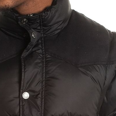 Die Hollis Jacke von WRUNG ist eine schöne schwarze Winterjacke im Dauenjacken-Style, mit abnehmbaren Ärmeln und Schulterpartie aus Kunstwildleder.